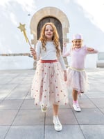 The Celestine tutu skirt is made out of neutral beige tone tulle decorated with red sequin hearts for a wow effect! Long and fluid with details that shine with every twist and turn, wear it at a party, for everyday adventures, dancing, dress-up or whenever a bit of glitter is needed with your outfit!