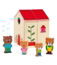A beautiful, solid wood play set; this hinged house opens to reveal 4 rooms, just the right size for the 4 animal characters who live there (characters included)