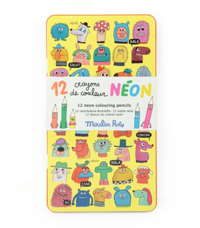 Bring your world to life with colour! A set of 12 neon coloured pencils, inspired by the Schmouks collection from Moulin Roty. The beautiful metal tin illustrated by Delphine Durand is perfect for keeping your pencils safe so you can take them with you wherever you go!