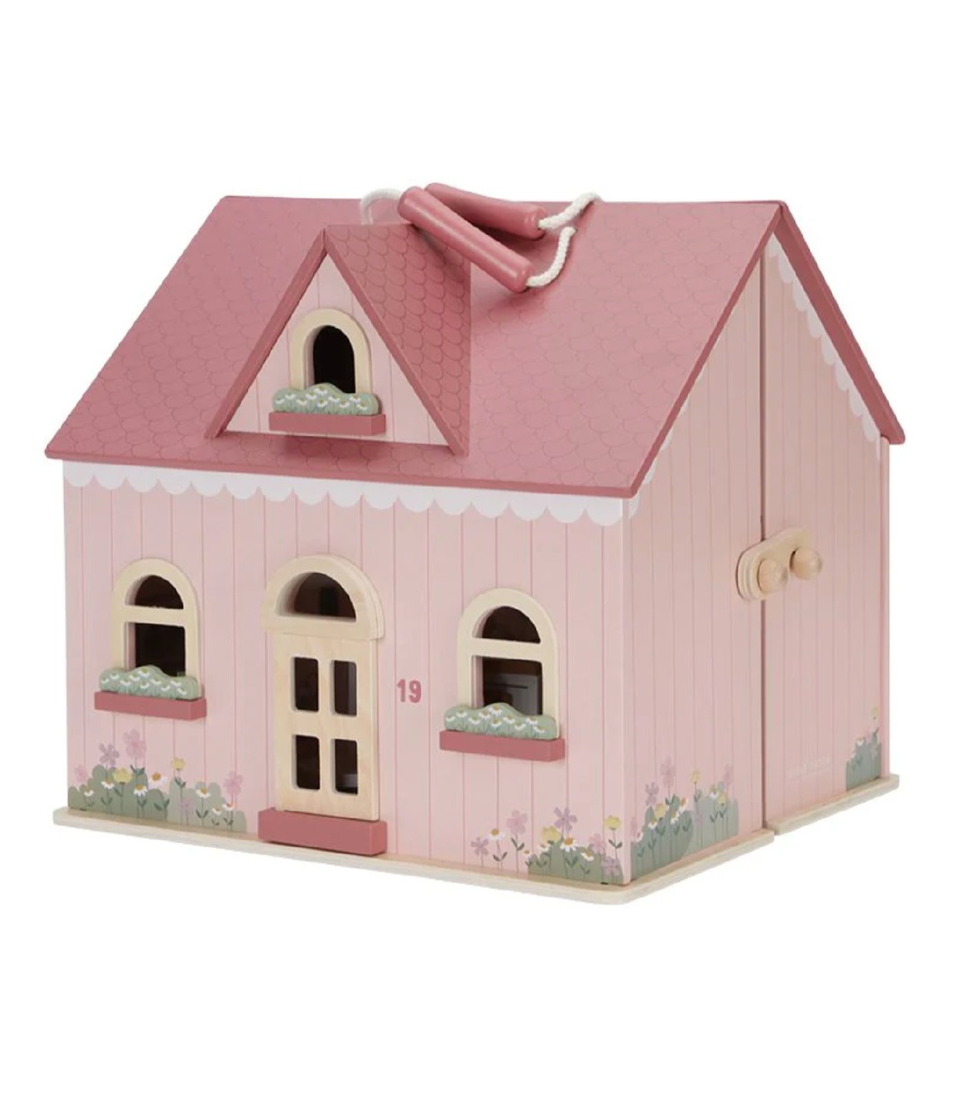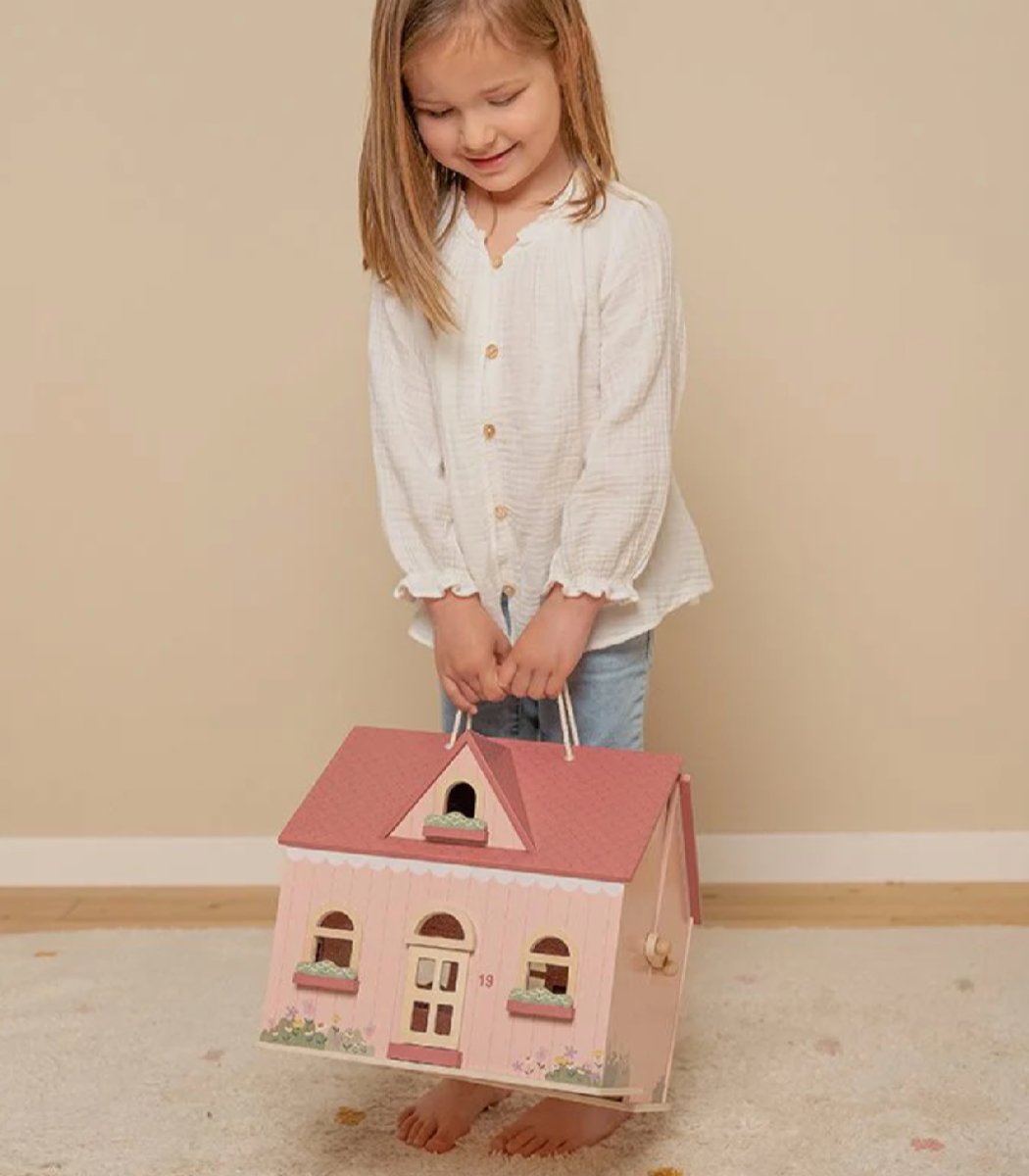 The wooden portable dollhouse from Little Dutch is a cute and cozy pink house with beautiful details. The house has a living room and kitchen downstairs, and a bedroom and bathroom upstairs. With the wooden closure, the dollhouse easily opens and closes, and thanks to the handle, it is easy to take anywhere. The furnishings are included and two small dolls are included.