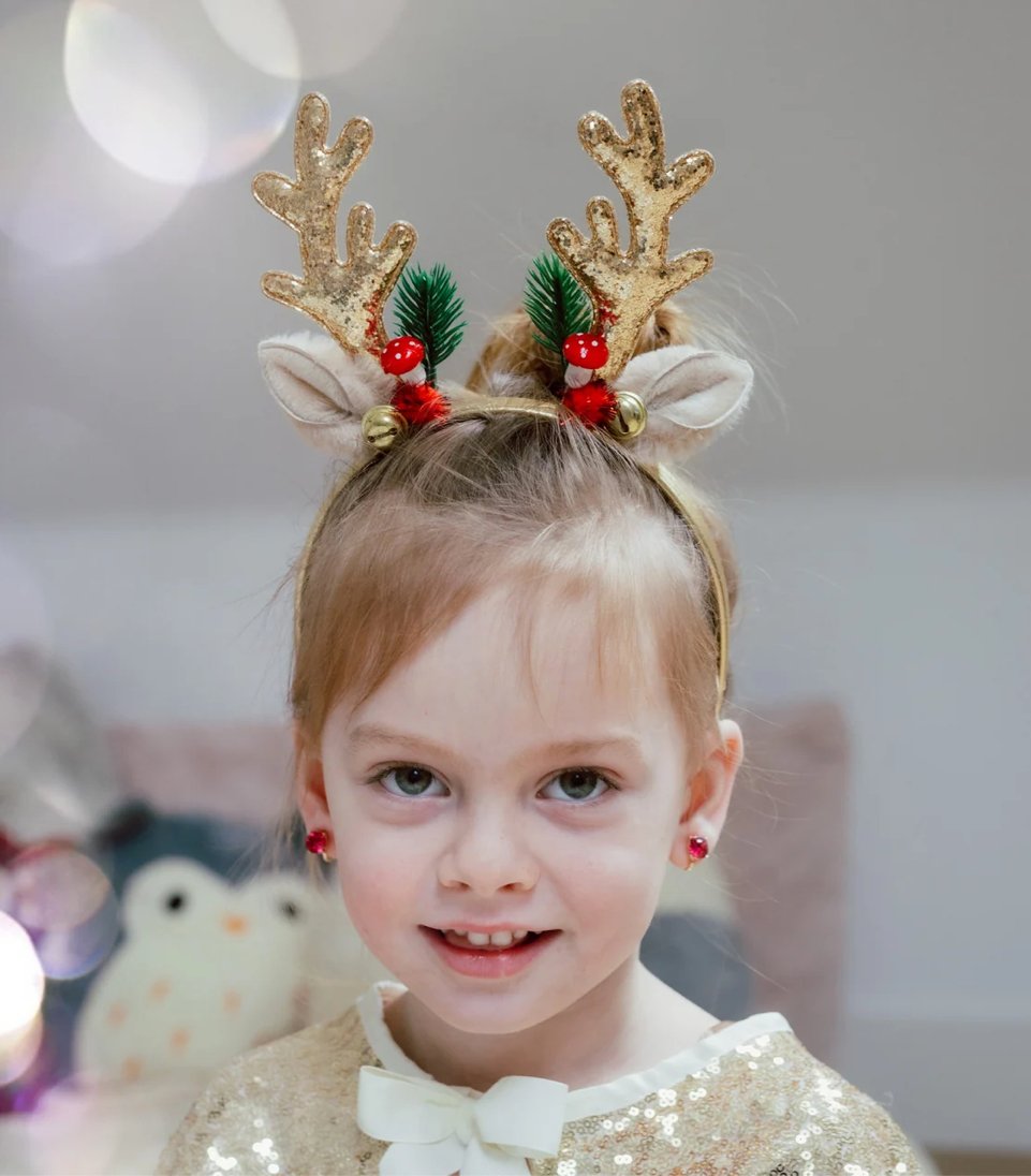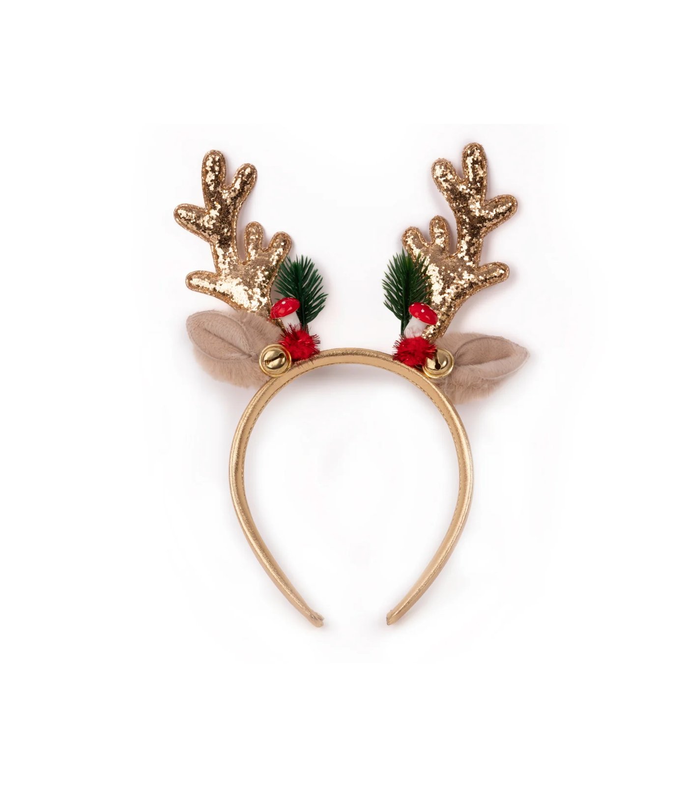 But that's not all - nestled at the base of the antlers, you'll find charming little gold bells, whimsical mushrooms, and a sprig of evergreen, evoking the charm of a winter woodland wonderland. So slip it on, jingle all the way, and let the magic of the holidays begin!